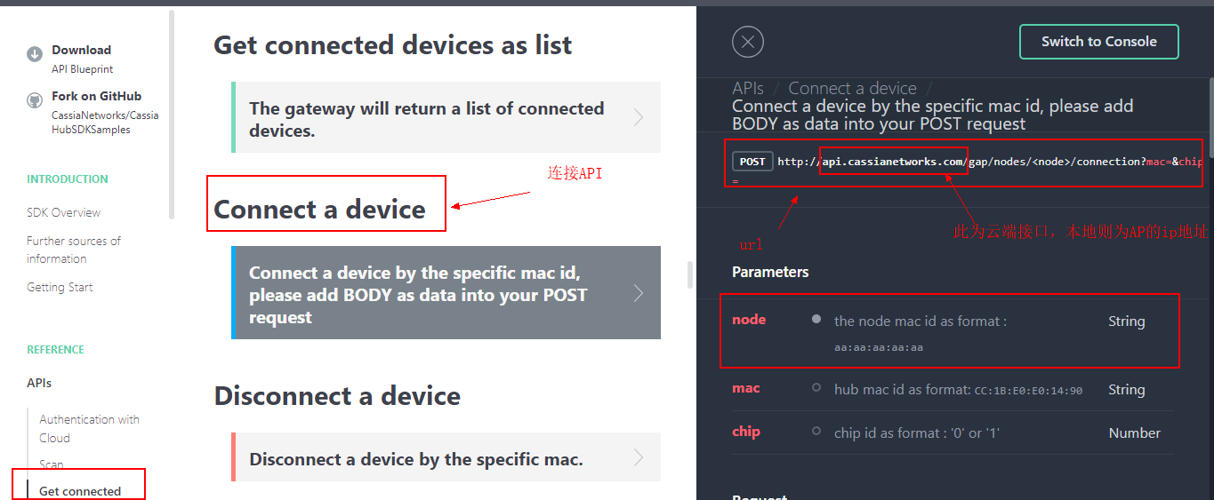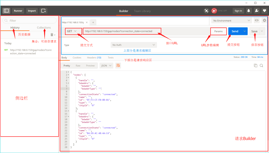 http://192.168.199.218/gap/nodes/<node>/connection?mac=&chip=post请求的data: ({ "timeout": "1",//此字段可不写(默认5s),最小值为1 "type" :"public" // `public` or `random` })