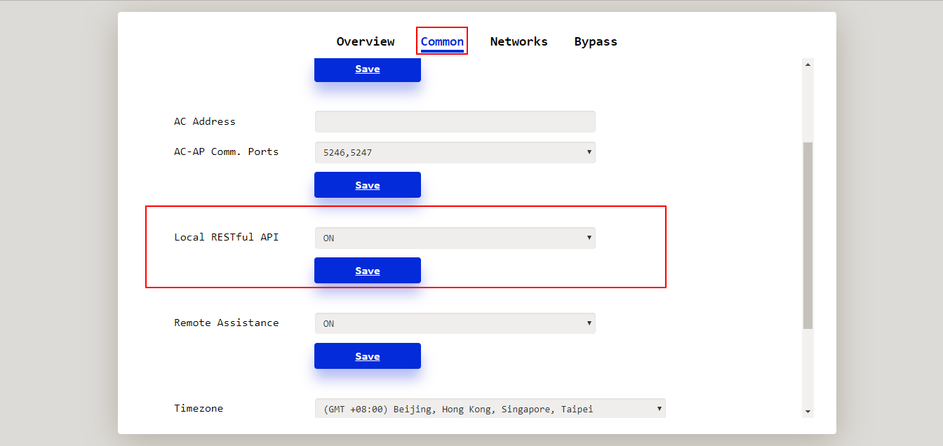 进入到配置页面后,在上部的common选项中有local api接口,打开保存后即可进行本地使用。