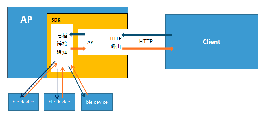 原理:上行通过api控制AP执行蓝牙层动作,下行蓝牙层与设备交互,并将获取到的数据通过API接口反馈
